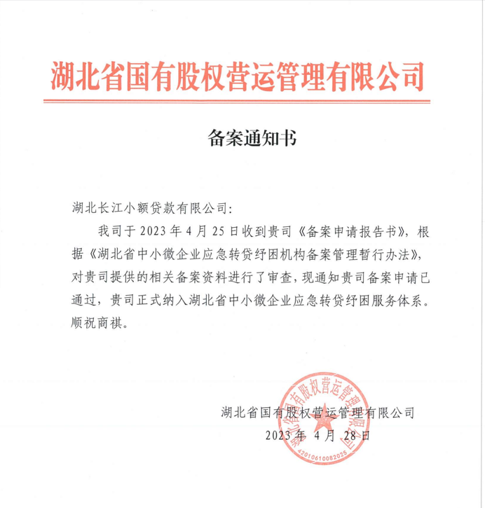 4月28日,长江运营旗下长江小贷公司通过湖北省国有股权营运管理有限公司备案审查,正式加入省中小微企业应急转贷经困服务体系。