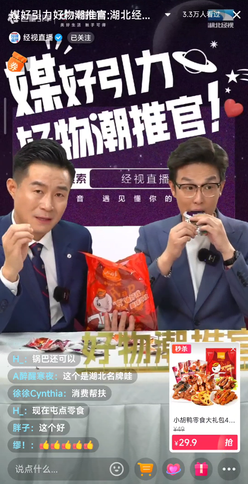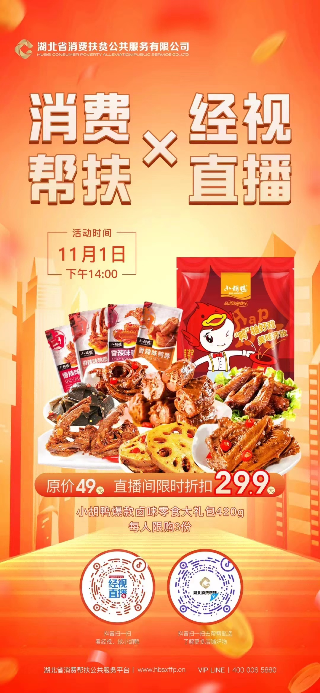 在直播中,省消费扶贫公司推送的荆州知名品牌“小胡鸭”成为直播热销,为消费扶贫“双十一”购物狂欢季拉开序幕。