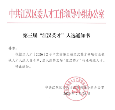 近日,武汉市江汉区委人才工作领导小组公布第三届“江汉英才”专项人才入选名单,长江运营(湖北产融)旗下产融创新公司董事长、总经理孙蕾,凭借在金融领域股权投资领域的突出业绩与创新贡献,成功入选,获评区级高层次人才并获得专项政策支持。