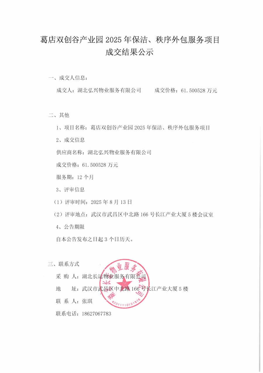 葛店双创谷产业园2025年保洁、秩序外包服务项目成交结果公示