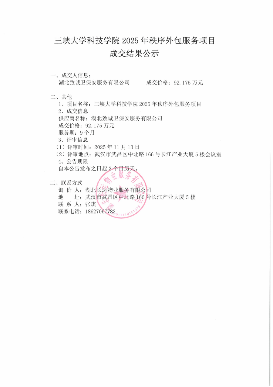三峡大学科技学院2025年秩序外包服务项目成交结果公示