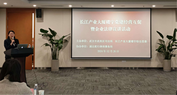 为深入贯彻落实习近平新时代中国特色社会主义思想,按照集团及长江运营党委关于长江产业大厦楼宇党建工作总体要求,扎实开展好“党旗红·产业兴”为主题的楼宇党建工作。12月26日,长江产业大厦楼宇综合党委会同武汉市武昌区司法局、湖北乾行律师事务所开展长江产业大厦楼宇党建经营互促系列活动暨“新公司法下股东及董监高的权利与责任”企业法律专题宣讲。