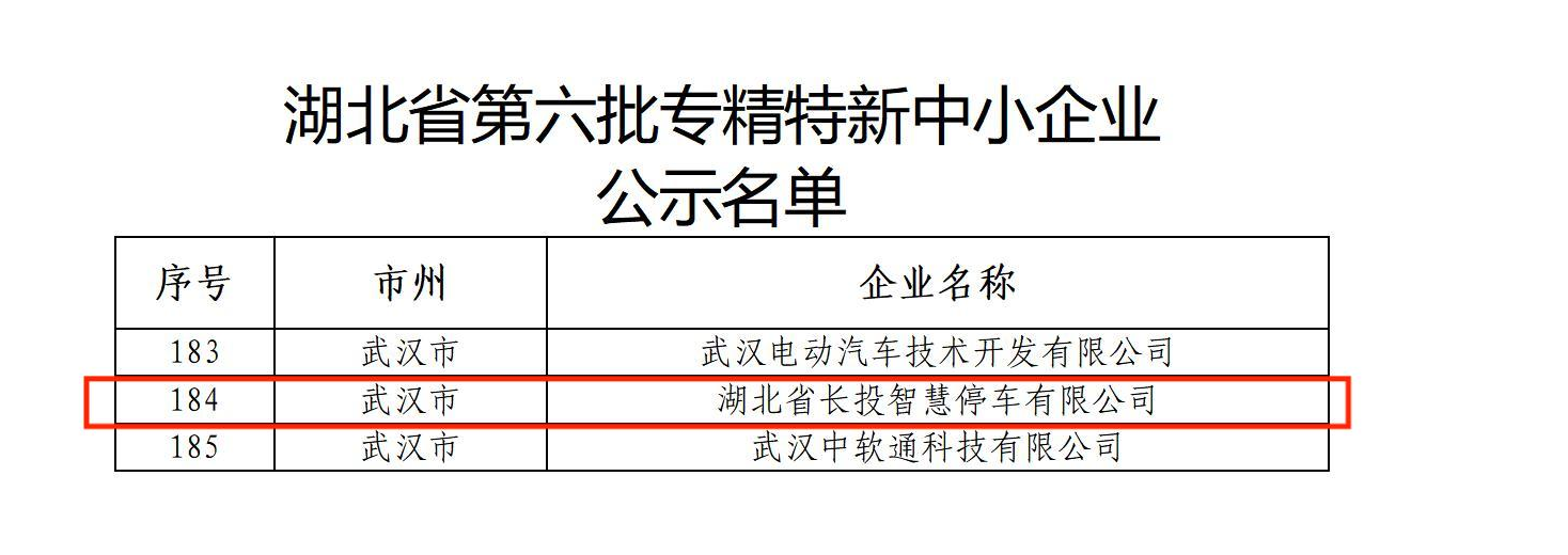 4月8日,湖北省经济和信息化厅公示了第六批专精特新中小企业名单,经相关部门初核和推荐、专家组审核等程序,长江运营旗下智慧停车公司凭借显著的科技创新能力荣登榜单,由此正式迈入专精特新企业行列。