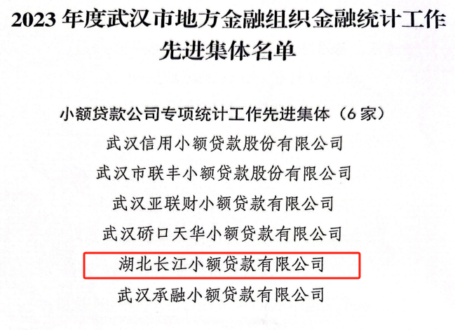 近日,中国人民银行湖北省分行营业管理部表彰了2023年度武汉市金融统计工作先进单位的通报,长江小贷荣获“2023年度武汉市地方金融组织金融统计工作先进集体”称号。