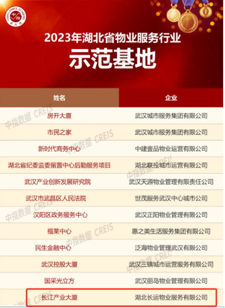 近日,中指研究院发布“2023年湖北省物业服务行业示范基地”名单,全省共12家物业服务项目入选,长运物业在管项目长江产业大厦成功入选“湖北省物业服务行业示范基地”。