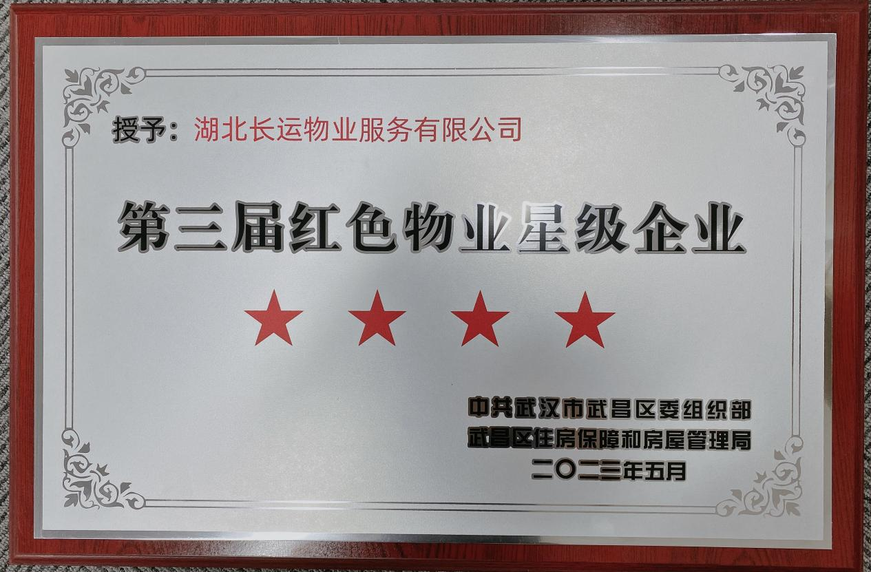 近日,武汉市武昌区人民政府发布武昌区第三届“红色物业星级企业”评选结果,武昌区共8家物业服务企业入选,湖北长运物业服务有限公司荣获武昌区“红色物业四星级企业”称号。