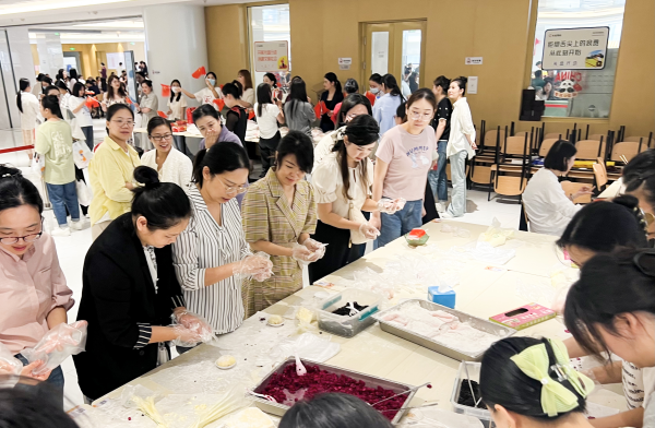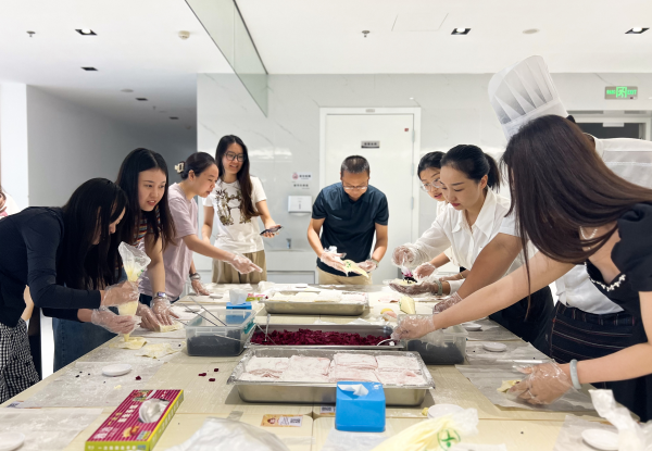除了精神盛宴,食堂还为大楼客户带来了味蕾上的享受。感受节日氛围的同时,还能品尝到亲手制作的美食,不外乎是一种“锦上添花”,在工作人员的指导下,大家化身“甜品师”,将专注与快乐注入进一个个形态各异的雪媚娘里,每个人的脸上都洋溢着满足和幸福的笑容,彼此分享着甜蜜心情。