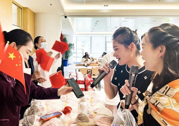 随着第一缕晨光穿透云层,大楼食堂已悄然换上了节日的盛装,现场挂满了以国庆为主题的装饰红旗,营造出了浓厚的节日氛围。“我会唱红歌”的活动区域内,已经吸引了不少人的驻足参与,饱满的热情和深情的歌声中满含对祖国繁荣昌盛的自豪,路过的客户们也都纷纷加入到合唱的行列中,现场好不热闹。