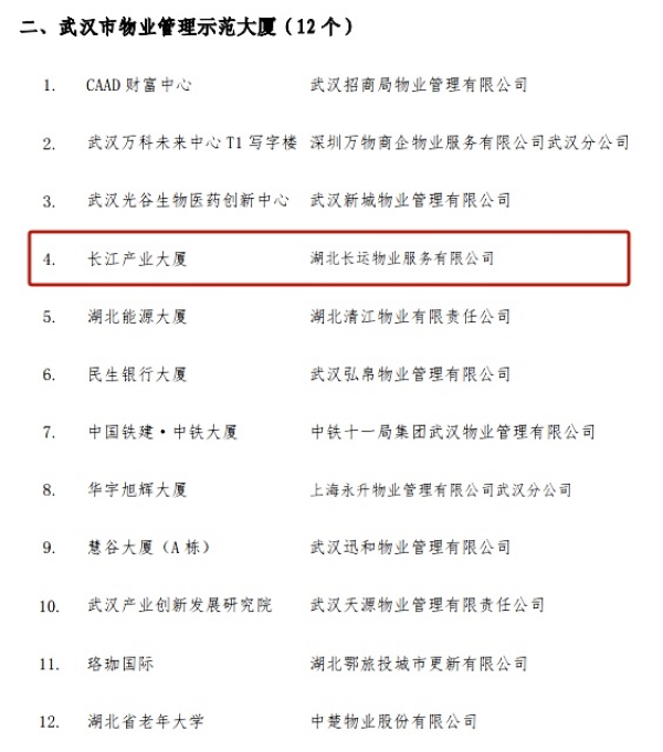 近日,武汉市物业管理协会发布“2024年武汉市物业管理示范项目住宅小区(大厦)”考评结果,全市共29家物业服务项目入选,长江运营旗下长运物业在管项目长江产业大厦成功获评“武汉市物业管理示范大厦”荣誉。