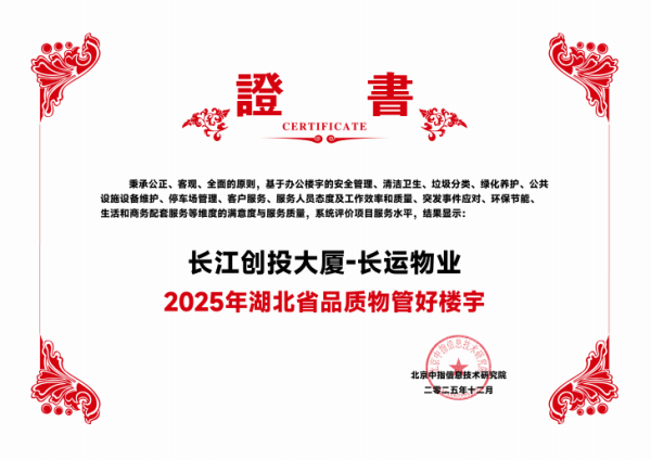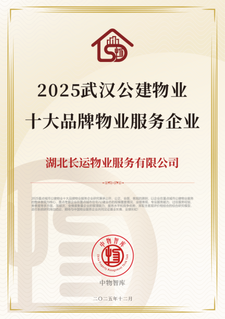 本次获奖,充分展现长运物业整体实力与服务成效。公司不仅获评“2025湖北省红色物业服务优秀企业”,同时荣登“2025年湖北省物业服务50强”榜单,在公建物业领域中获“2025武汉公建物业十大品牌物业服务企业”。