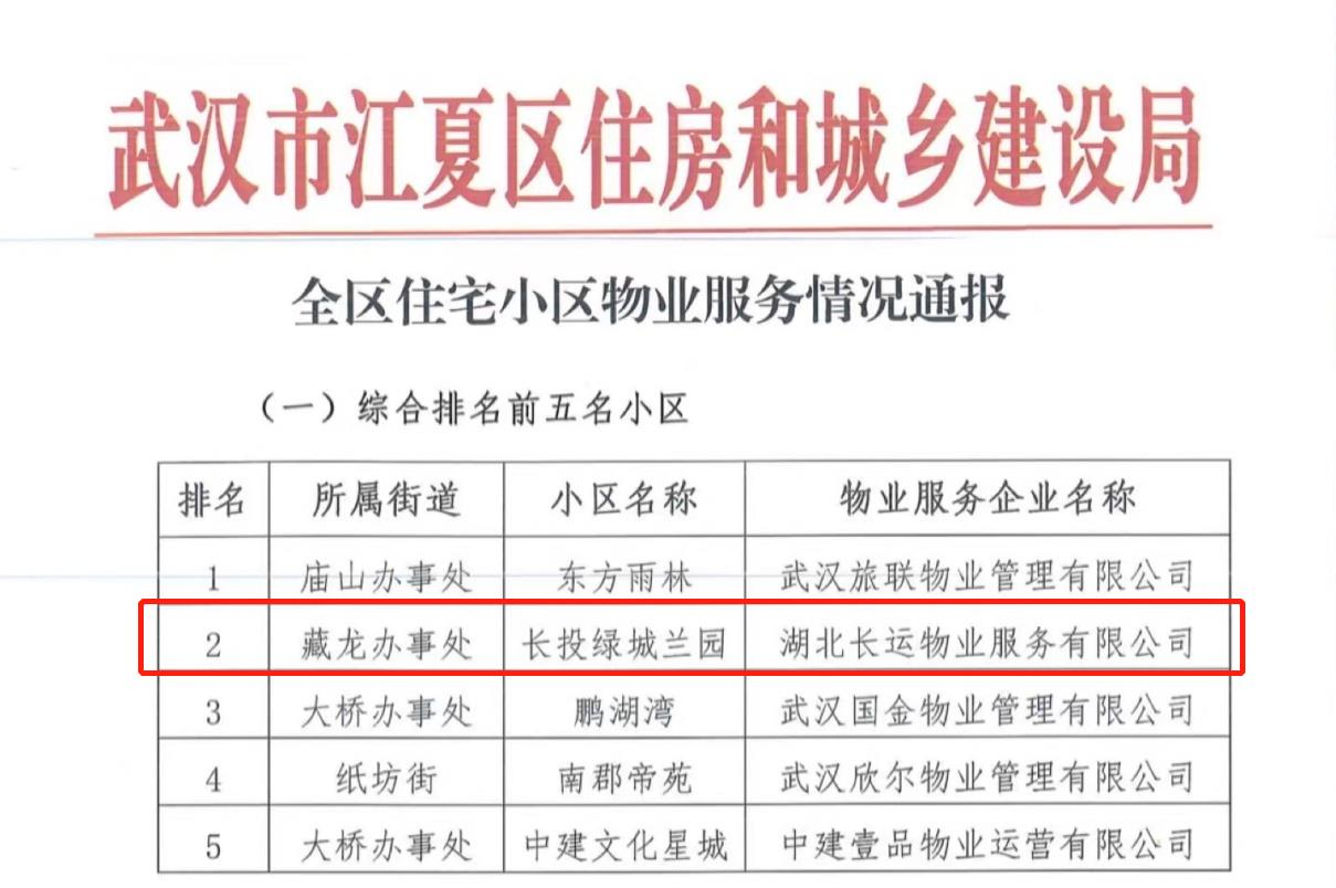 10月13日,江夏区住房和城乡建设局公布本次全市住宅小区物业服务检查情况,长江运营旗下长运物业公司荣获第二名的好成绩!该项目是位于江夏区的蘭园住宅项目,其检查内容涵盖物业小区综合管理服务、公共秩序维护管理、公共设施设备维护管理、公共部位卫生环境和绿化养护管理及常态化疫情防控等工作。