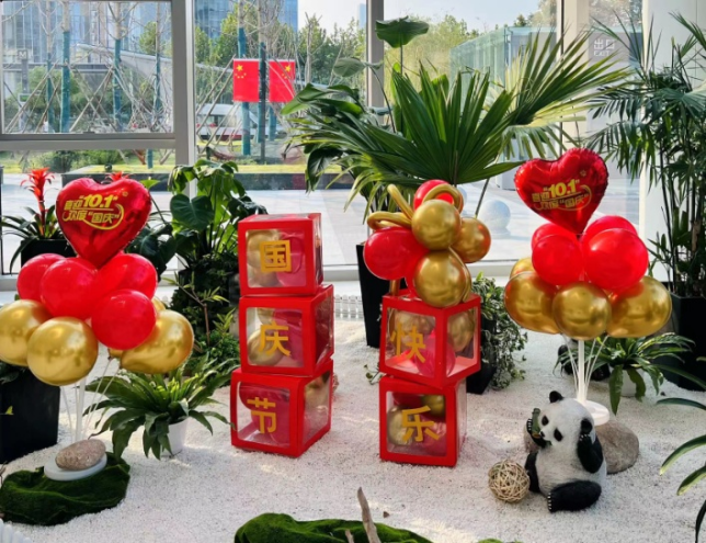 大堂正壁下,花团锦簇的盆栽环绕着“欢度73周年国庆”的大型金色文字,以及“盛世中华、举国同庆”的标语,爱国情感映入眼帘、直入心怀。美化绿植旁,“国庆节快乐”的方形展框,搭配红色爱心形气球和金蛋气球,给人以富足、美满的体验,让人体会到国家繁荣所带来的生活幸福感。