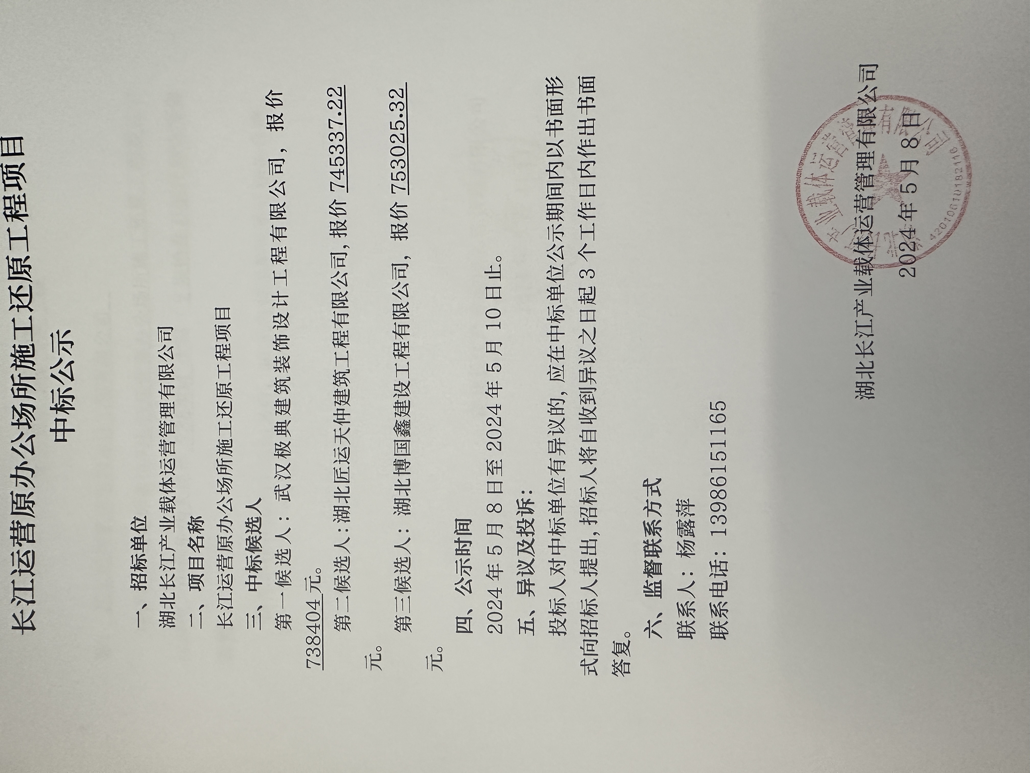长江运营原办公场所施工还原工程项目中标公示