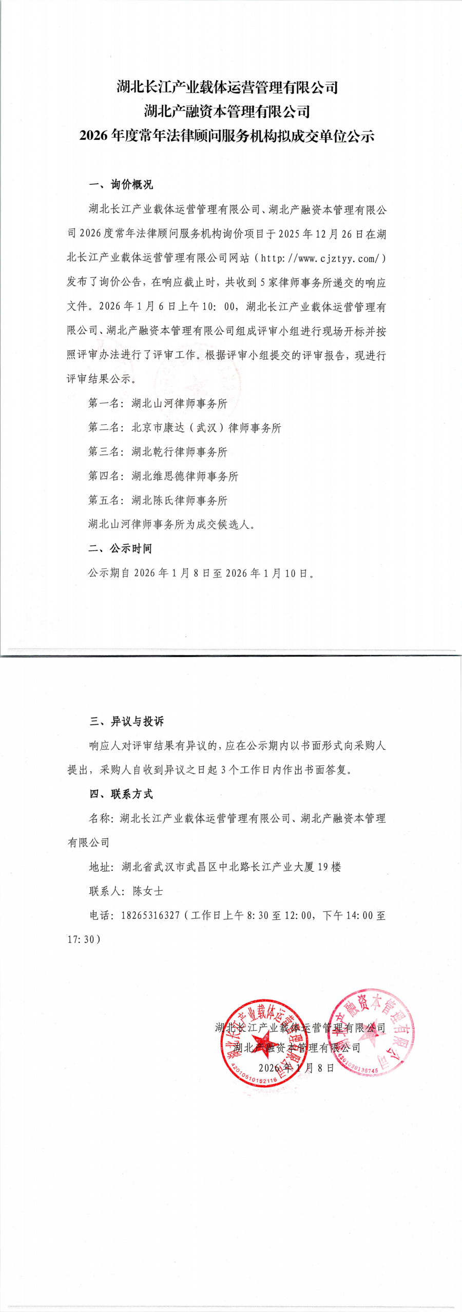 湖北长江产业载体运营管理有限公司、湖北产融资本管理有限公司2026年度常年法律顾问服务机构拟成交单位公示